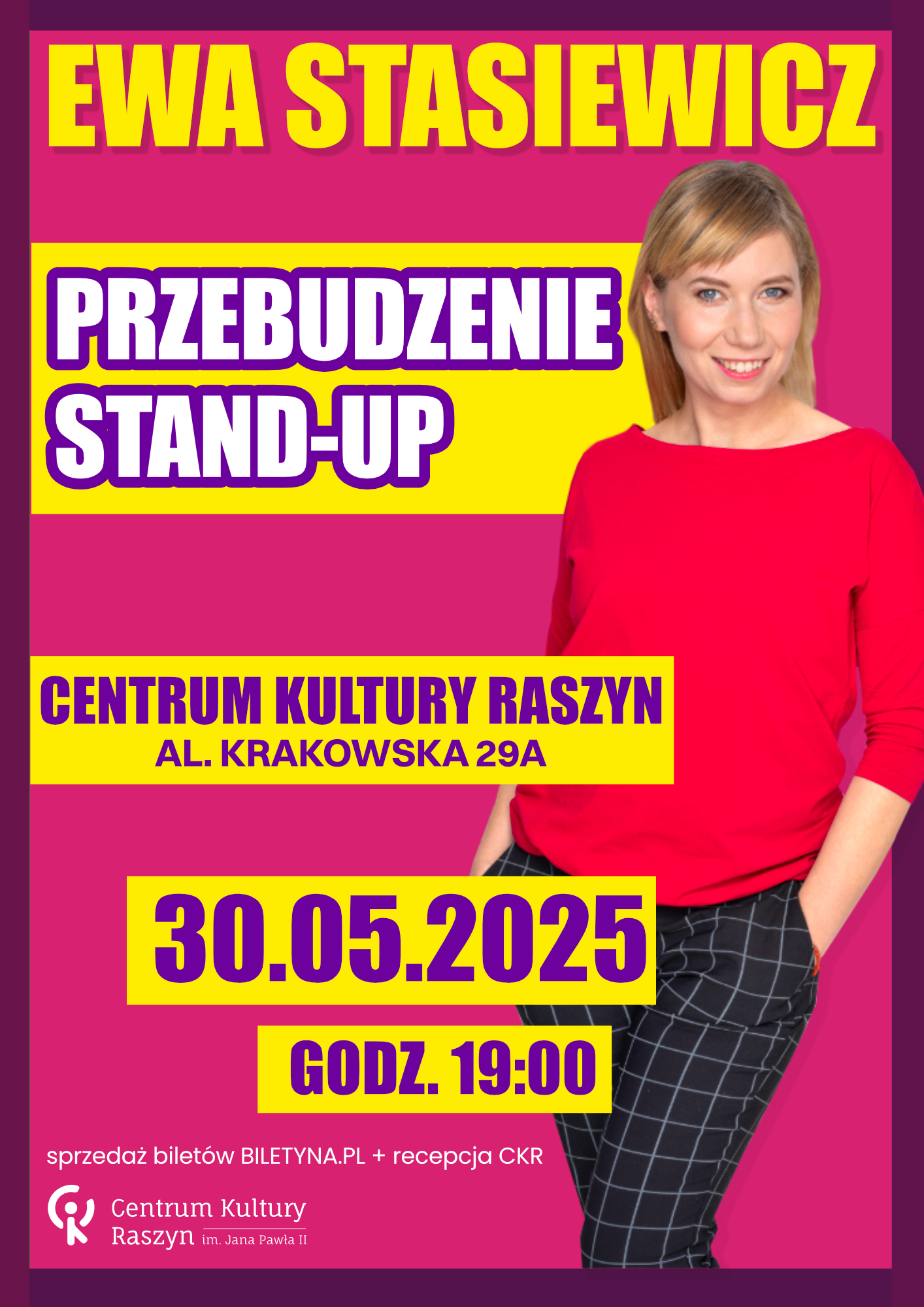 Centrum Kultury Raszyn zaprasza na wieczór Stand-up Comedy, podczas którego Ewa Stasiewicz wystąpi ze swoim najnowszym programem “Przebudzenie”.