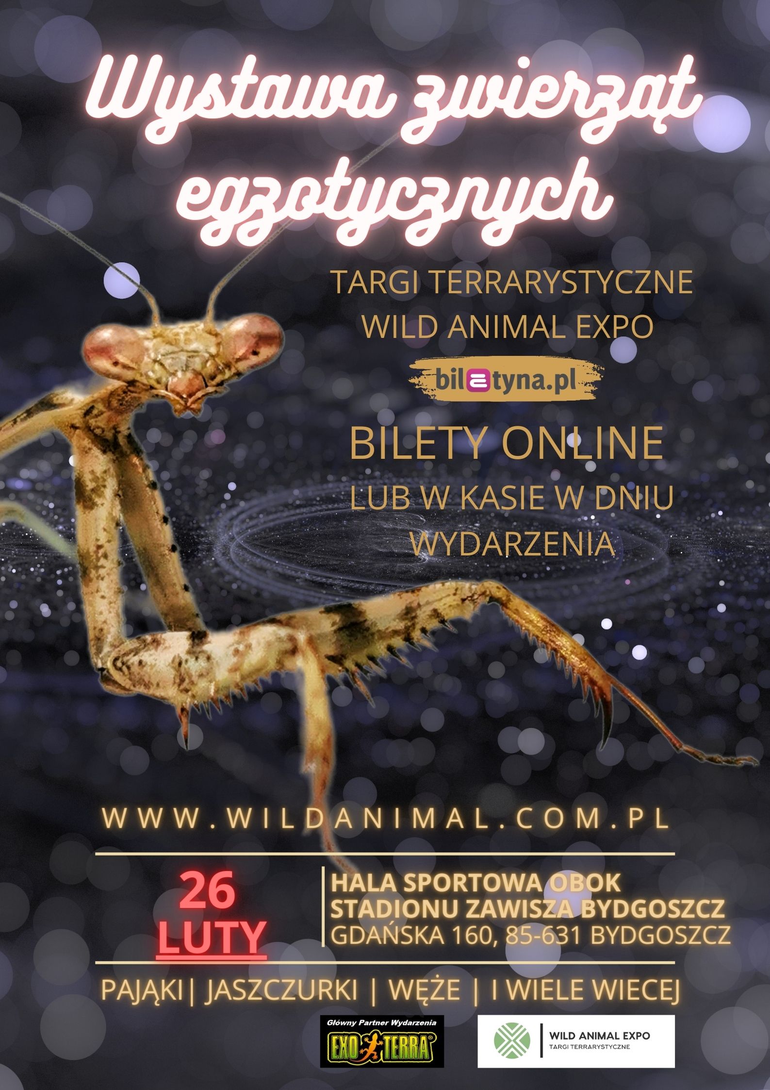Już 26 lute 2023r. widzimy się w Bydgoszczy na Hali Sportowej przy Stadionie \Miejskim Zawisza ul. Gdańska 160. Węże, pająki, jaszczurki, skorpiony, owady karmowe, mrówki, żółwie, żaby i wiele innych niesamowitych zwierząt pod jednym dachem. Poza zwierzakami na miejscu będą czekały na Was terraria z całą aranżacją gotowe do zamieszkania oraz takie do samodzielnego przygotowania. Akcesoria, pokarmy, dekoracje czyli wszystko co jest potrzebne do samodzielnego stworzenia kawałka niesamowitej dżungli czy pustynnych stepów.Zafunduj sobie i swoim bliskim popołudnie z egzotyką.Bilety również dostępne w dniu wydarzenia: Normalny 30 zł Ulgowy 25 zł Wstęp: Od 10:00 do 16:00 Rejestracja wystawców +48 729 859 409 [email protected]