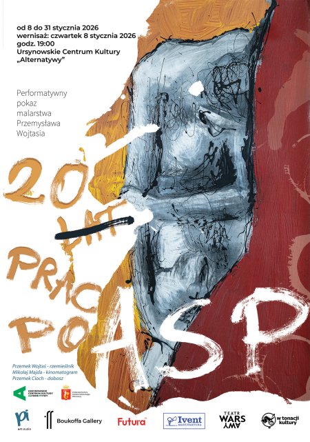 „20 prac po ASP” to cykl obrazów oparty na rysunkach powstałych dwie dekady temu w murach Warszawskiej Akademii Sztuk Pięknych. Wystawa jest hołdem dla czasów studenckich – intensywnych, twórczych i pełnych spontaniczności, choć ubogich materialnie. Dwadzieścia obrazów, powstałych przy użyciu jednego pędzla, śrubokręta i farby ftalowej, stanowi powrót do okresu, w którym nie istniały żadne granice ani zahamowania. Najważniejsze było jedno: malować – ponad wszystko, wszędzie i na wszystkim. Wernisaż będzie miał formę performatywnego pokazu malarstwa, a nie klasycznej prezentacji prac. Przestrzeń zostanie zadymiona i wypełniona kolorowym światłem reflektorów, a rytm całości zbuduje grający na żywo perkusista. Instalacja tworzy wizualno-dźwiękowy portret umysłu młodego studenta ASP sprzed 20 lat – jego emocji, chaotycznych impulsów i nieustannej potrzeby kreacji. Towarzyszy jej film ukazujący pogoń bohatera. Za czym? To pozostaje kwestią indywidualnej interpretacji widza, otwartym pytaniem zawieszonym między młodością a sztuką.
